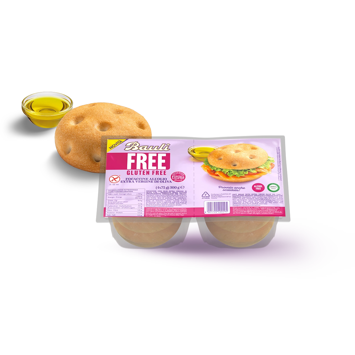 Ingredienti: acqua, lievito madre (28,4%) [farina di riso, acqua], farina di riso, amido di mais, olio extra vergine di oliva (7,6%), fibra di psyllium, sale, addensante:...