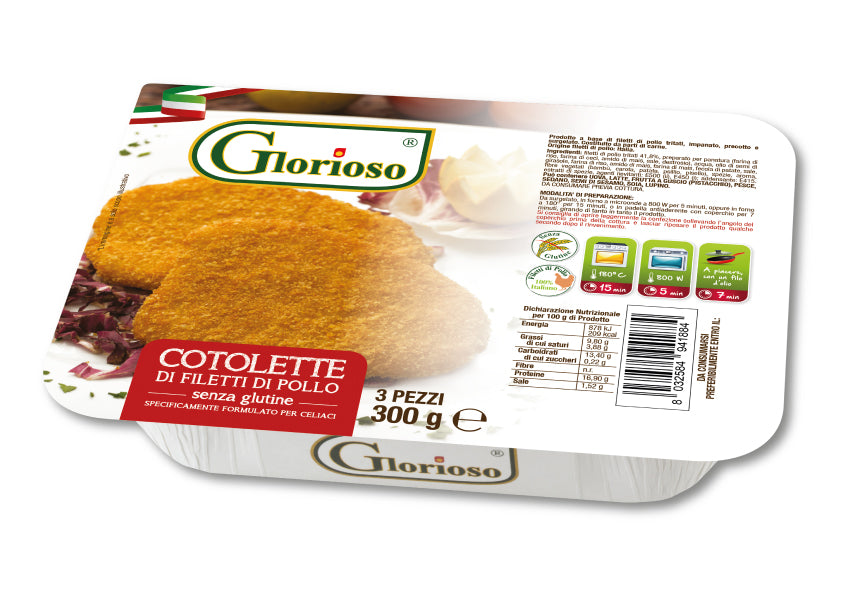 Translator Cotoletta a base di filetti di pollo tritati, impanato, precotto e surgelato. INGREDIENTI: Filetti di pollo tritati 42%, proteine di pisello, olio di semi...