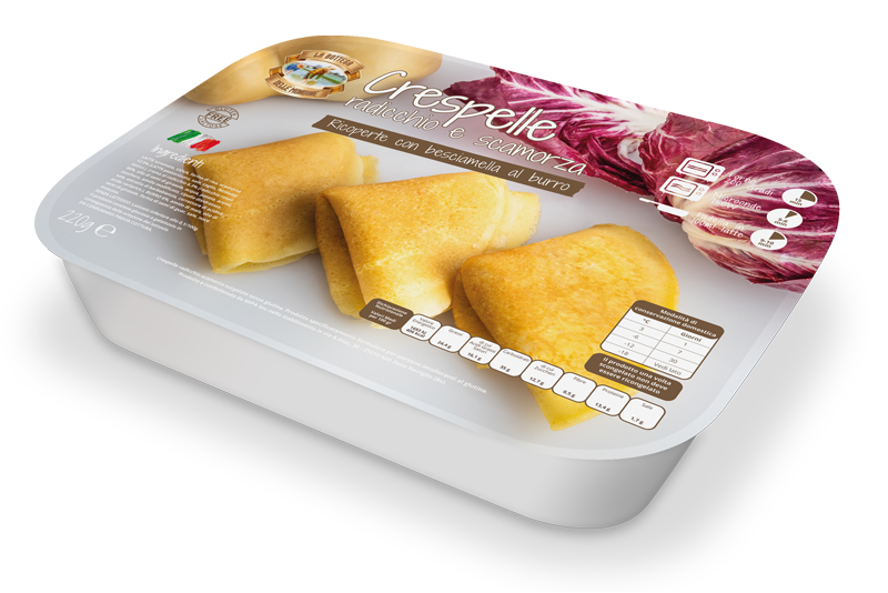 LATTE scremato, UOVA, farina di riso, scamorza 12.5% (LATTE pastorizzato, sale, caglio, fermenti lattici.), crema al radicchio 6.3% (radicchio rosso 66%, olio di semi di girasole, acqua, patata, aromi, zucchero, amido modificato, cipolla disidratata, sale, estratto di barbabietola, correttore di acidità: acido tartarico.), BURRO 6%, amido di mais, olio di semi di girasole, farina di semi di guar, sale, noce moscata.
