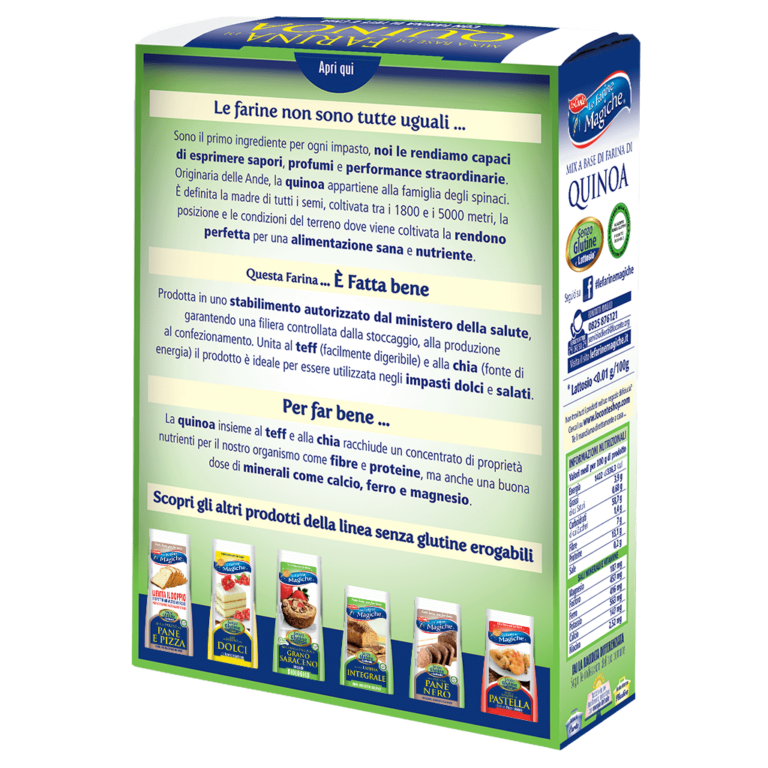 La Farina di Quinoa,prodotta in uno stabilimento autorizzato dal ministero della salute, garantiamo una filiera controllata dallo stoccaggio, alla produzione, al confezionamento. Unita al teff (facilmente digeribile) e alla chia (fonte di energia) il prodotto è ideale per essere utilizzato negli impasti dolci e salati.